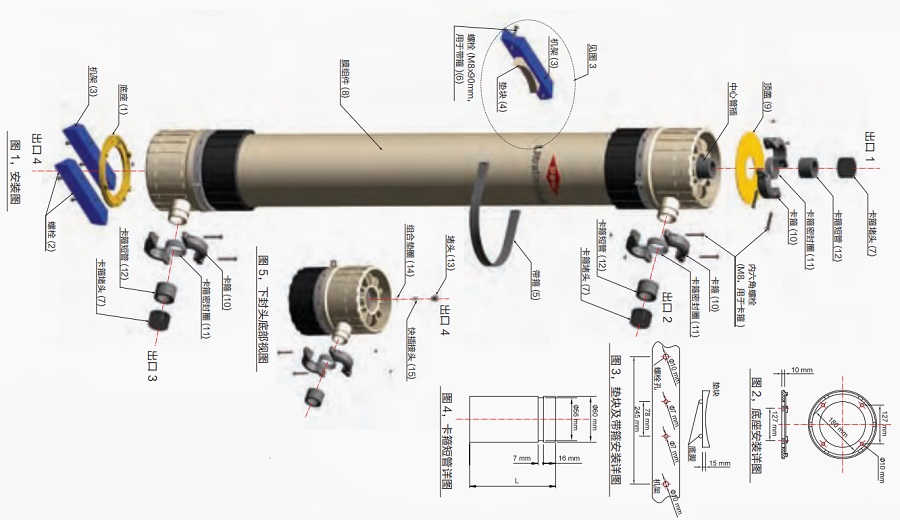 4.在出口 1處,拆卸濃水墻頭(7),在出口2和3處,拆卸產(chǎn)水及進水試壓端蓋(8,9)豎直放置組件,使組件內(nèi)保護液排空保存濃水培頭及試壓端蓋以備將來使用。
